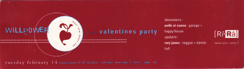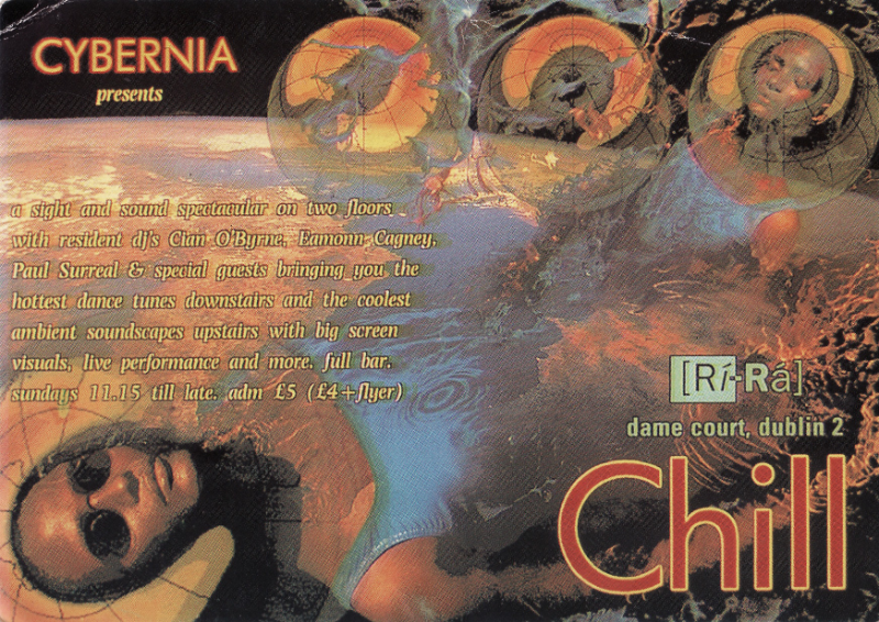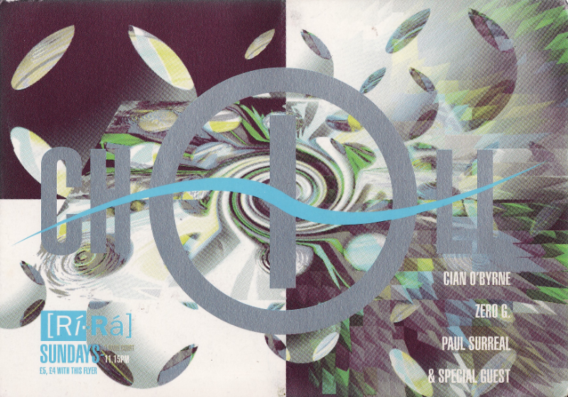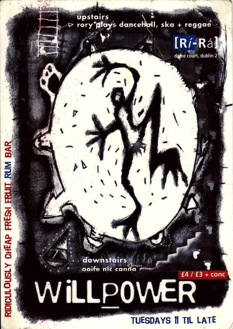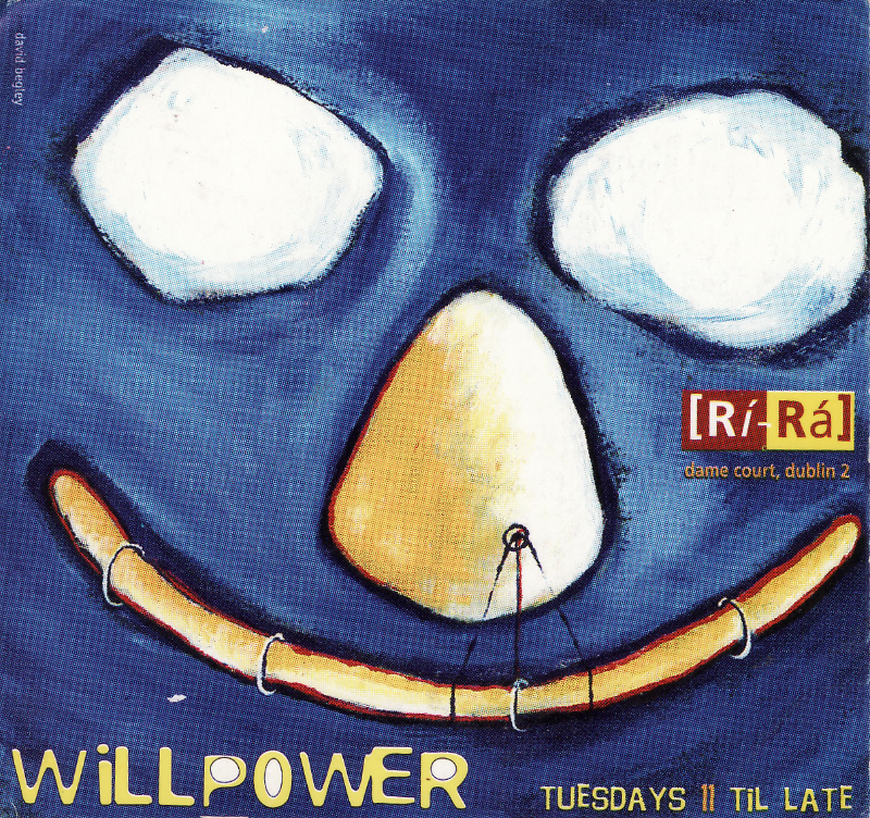 One of the stand-out flyer designers of the mid-90s was David Begley, now an accomplished artist, who while in his early 20s painted a series of polychromatic pieces for Willpower, a night held at Dublin’s iconic Ri-Rá venue, which along with The Globe upstairs helped “deliver sounds for groovers of every musical persuasion,” as a 1993 newspaper article put it.