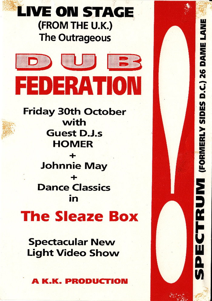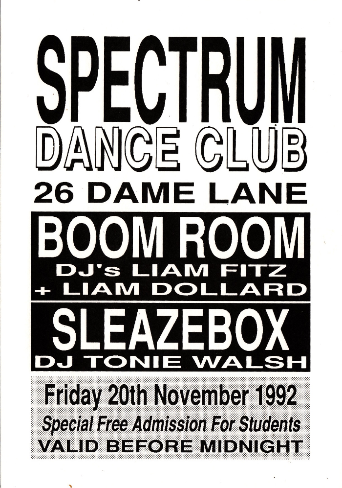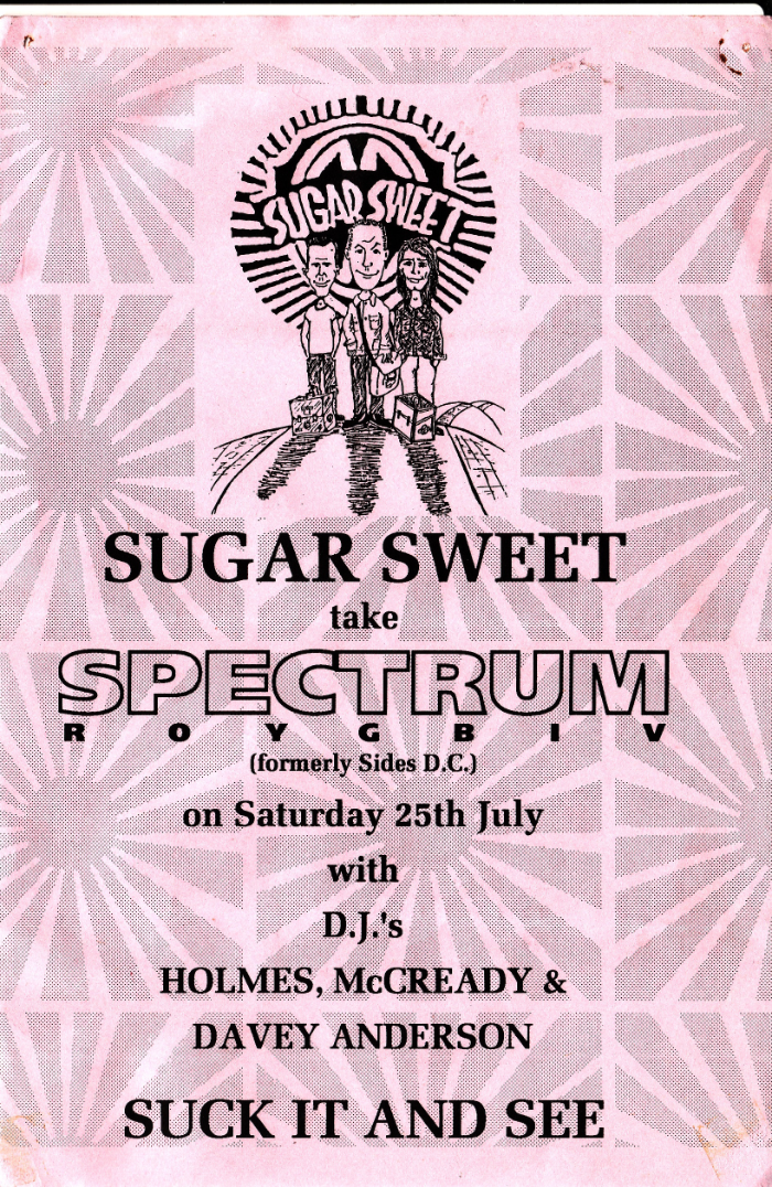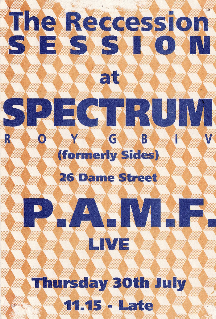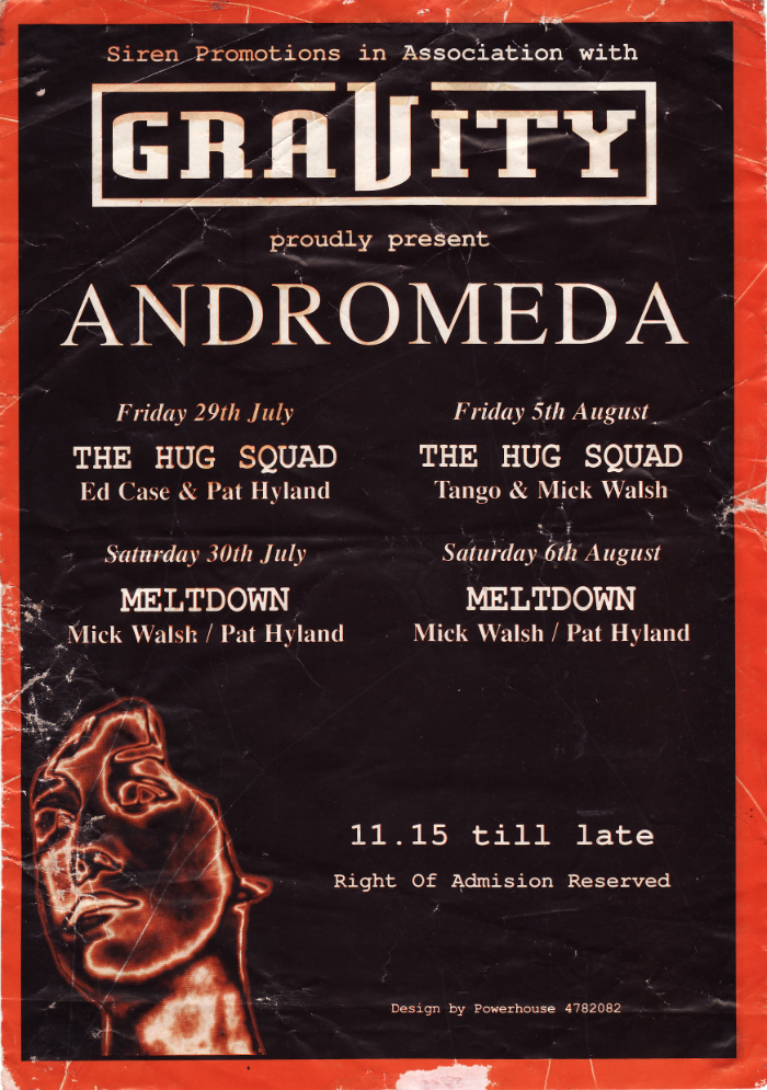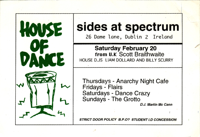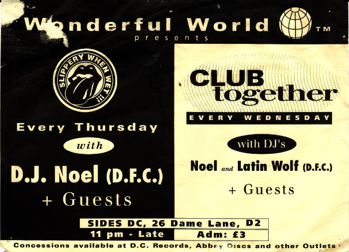 “The first ever DJ weekender was run in Ireland at Sides DC in Dame Street in March 1991. It was a few weeks before the first ever ‘rave’ at the Olympic Ballroom and on the first night of it Primal Scream were playing elsewhere in Dublin, at the SFX apparently. I vaguely recall them being supported by a long- haired Andrew Weatherall who arrived into Sides DC after the Scream gig clutching a bottle of vodka hidden under a long great coat. Jumpin’ Jack Frost played; he was the first DJ I ever saw scratch, he scratched his name as part of his intro. Greg D, Mike Pickering were on the line-up too.