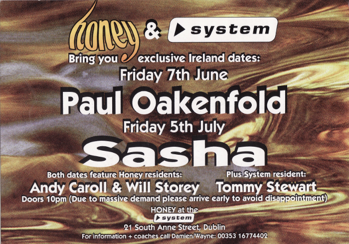 I met Damien Higgins [Honey promoter] at Leeds University. While I’ve been living in Ireland half my life, I’m from Newcastle originally, and I was studying in Leeds. I used to put on house parties on the campus, and Damien ended up randomly popping into one of these parties. He thought I was a good DJ and told me that he had contacts in Dublin, and he was planning on putting on the occasional nights in a club there, which was The System.